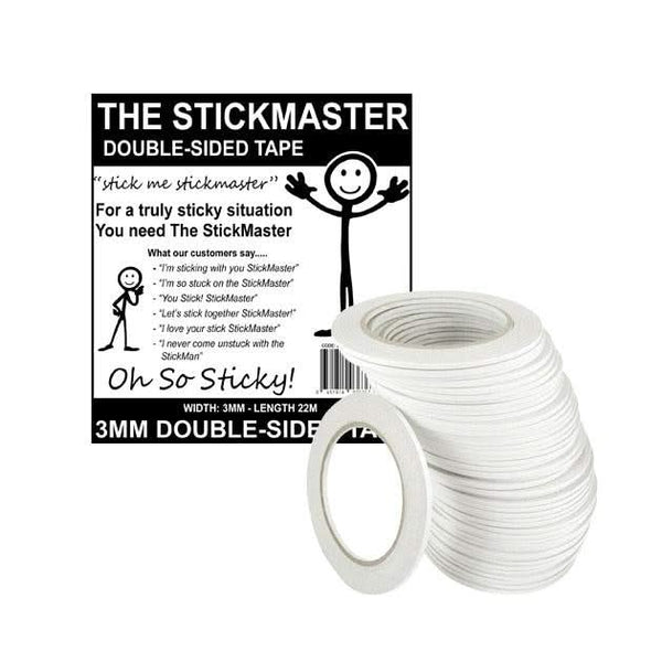 The Stickmaster - double-sided tape - 3mm x 22m - This white double-sided tape is secure and easy to use for most craft projects. Super sticky and perfect for all craft projects including use with ribbons, glitter, embossing, box making and so much more! Package contains a single roll of 3mm x 22m double-sided tape. Acid Free