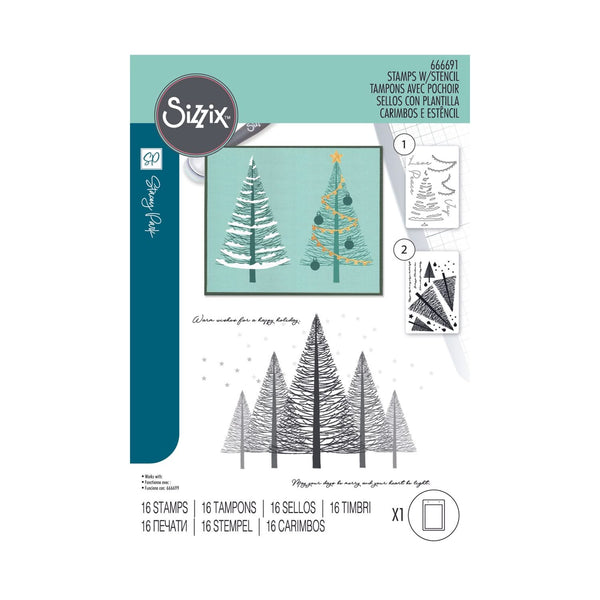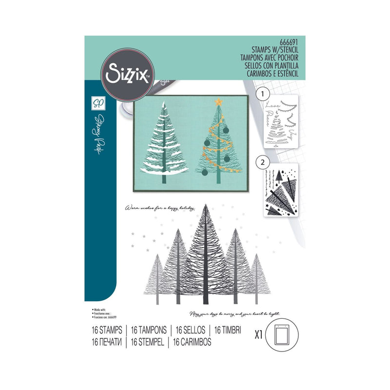 Sizzix A5 Cosmopolitan Christmas Clear Stamp Set With Stencil By Stacey Park - Merry & Bright. Have a cosmopolitan Christmas with this striking stamp set by Stacey Park. This Cosmopolitan Christmas, Merry and Light 16-pack of stamps with a stencil and is perfect to infuse your festive season with a touch of glamour and creativity. Perfect for creating cards, gift wrap, and home décor pieces with more than sparkle and shine. Let's make this Christmas merry, bright, and oh-so-chic! This set works perfectly with Fanciful Framelits, Patti's Perfect Triangles also designed by Stacey Park (666699, sold separately). Compatible with most die-cutting machines (sold separately). Approximate Design Size: 4 1/8” x 6 1/2” - 1/2” x 5/8” (10.48cm x 16.51cm - 1.27cm x 1.59cm).