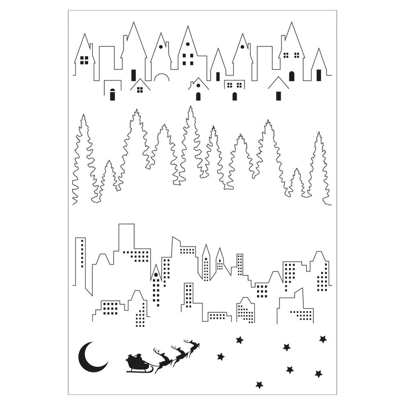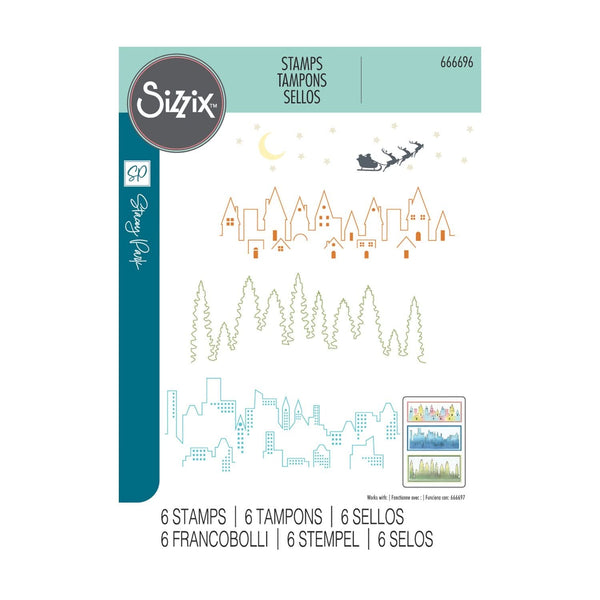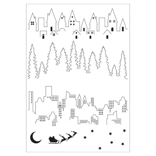 Sizzix A5 Cosmopolitan Clear Stamp Set By Stacey Park - The View. Step into the cosmopolitan world with Stacey Park's exquisite Clear Stamps Set - Cosmopolitan, The View. This 6 pack of stamps invites you to explore cityscapes and forestry through a lens of creativity and sophistication. This set also includes Santa Claus in his sleigh with his reindeer, a moon and stars perfect for adding that festive feel to your city and forest makes. This set has been designed by the talented Stacey Park to work her Stencil Cosmopolitan, The View #2 (666697, sold separately). Approximate Design Size: 5 3/4” x 2 1/2” - 1” x 1” (14.61cm x 6.35cm - 2.54cm x 2.54cm).