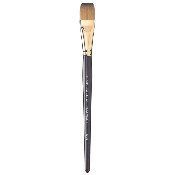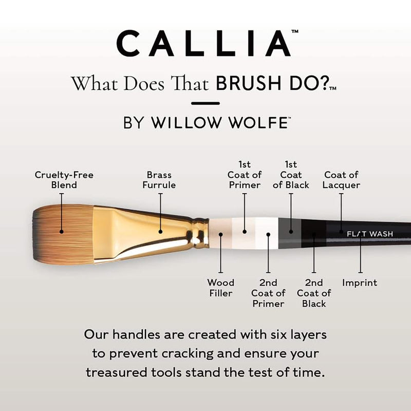 Willow Wolfe Callia Artist Flat Wash Brush 3/4" - Callia Artist Brushes, designed by renowned artist, author and educator, Willow Wolfe, bring together innovative synthetics and precise craftsmanship, making them ideal for acrylic, oil, and watercolour painting. They come in a variety of traditional and unique shapes and sizes, using synthetic 100% cruelty-free blends like Synthetic Kolinsky, Synthetic Bristle, Synthetic Sable, and Golden Taklon. These brushes are handcrafted for excellent spring and snap, precise colour control, and are equipped with high-quality brass ferrules. They maintain their shape and feature Willow's signature six-layer, crack-resistant handle. Callia is designed by artists for artists to paint beautifully and be your trusted and treasured brush of choice! This package contains one Flat Wash paint brush. Size: 3/4.