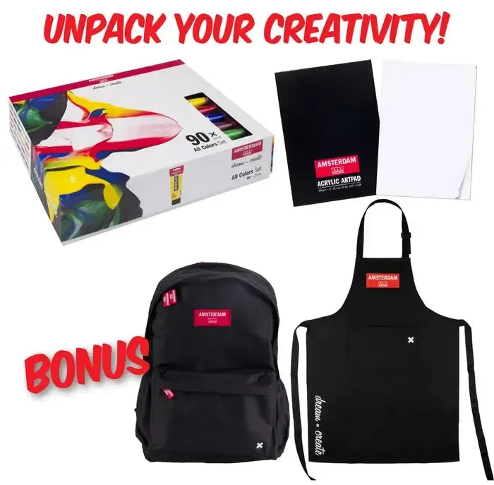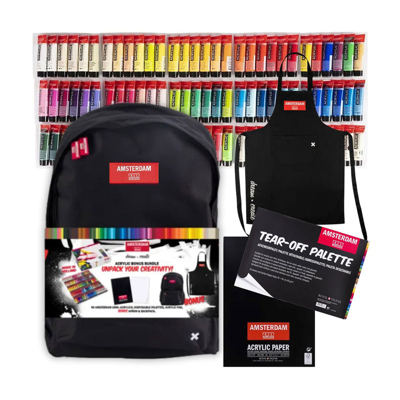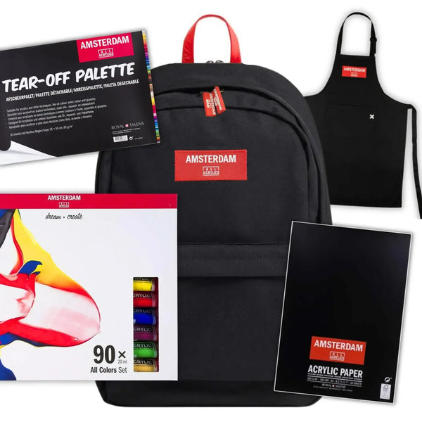 Discover the ultimate all-in-one artist set with the Amsterdam Acrylic Paint Backpack by Royal Talens. This premium collection features 90 x 20ml tubes of vibrant Amsterdam Standard Series Acrylic Paints, an artist apron, tear-off palette pad, acrylic art pad, and a durable black canvas backpack, perfect for artists on the go or working in the studio.