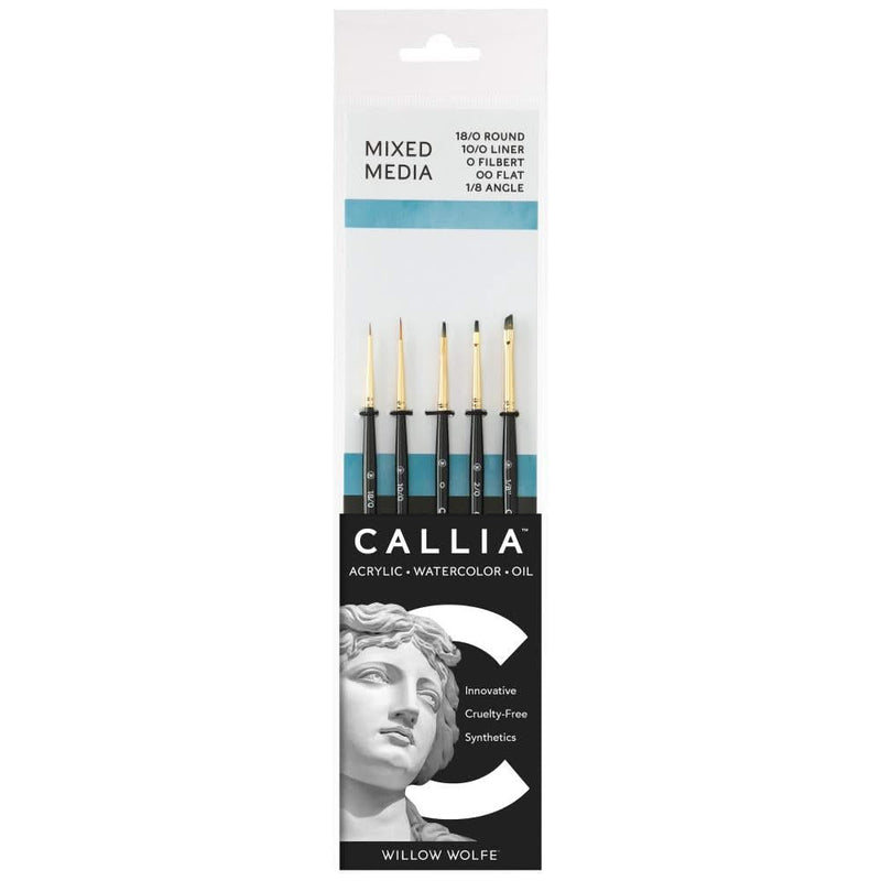 Willow Wolfe Callia Artist Mixed Media Detail Brush Set Round, Liner, Filbert, Flat, Angle - Callia Artist Brushes, designed by renowned artist, author and educator, Willow Wolfe, bring together innovative synthetics and precise craftsmanship, making them ideal for acrylic, oil, and watercolour painting. They come in a variety of traditional and unique shapes and sizes, using synthetic 100% cruelty-free blends like Synthetic Kolinsky, Synthetic Bristle, Synthetic Sable, and Golden Taklon. These brushes are handcrafted for excellent spring and snap, precise colour control, and are equipped with high-quality brass ferrules. They maintain their shape and feature Willow's signature six-layer, crack-resistant handle. Callia is designed by artists for artists to paint beautifully and be your trusted and treasured brush of choice! This package contains one each size 0, 4, 6, and 8 Fine Rounds.