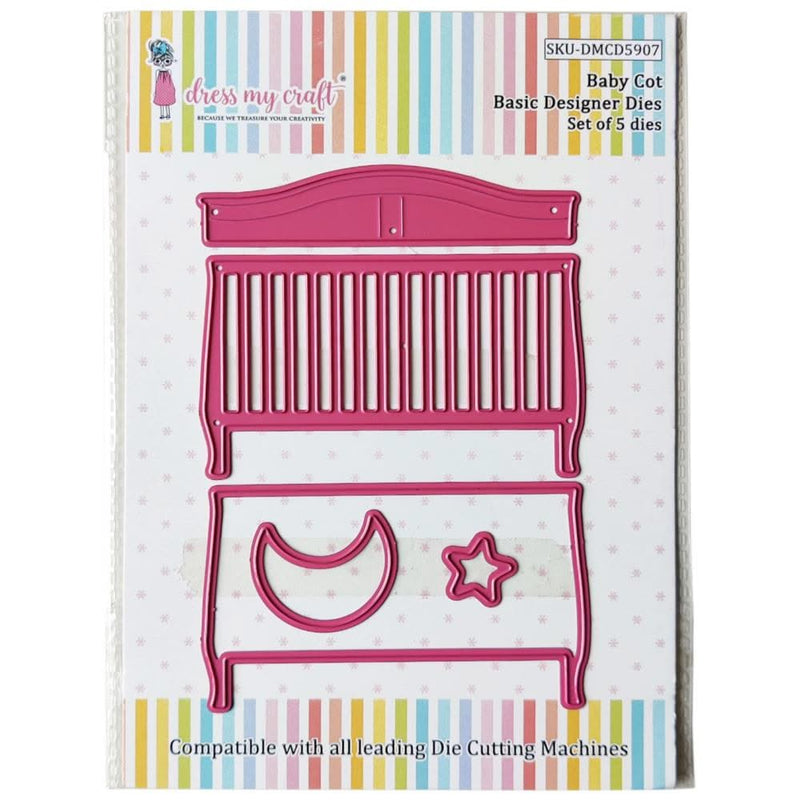 Dress My Craft Basic Designer Dies Baby Cot - Specially designed dies to jazz up your craft projects and parties. You can create beautiful projects by using these dies. Make your days special with our special sentiments and celebration dies. These wafer-thin die sets are designed to cut, emboss, or stencil a single sheet of cardstock, paper, foam, burlap, thin plastic, metallic foil, vellum, etc. These are very compatible with Easy Cuts PRO, Easy Cut Machine (Dress My Craft), Cuttlebug, Sizzix BIGkick, BIg Shot, Vagabond, Gemini, Grand Calibur, Spellbinders Platinum, Big Shot Pro machines, etc. This package includes 5 metal dies sized between 0.55 inches to 4.01 X 0.82 inches.