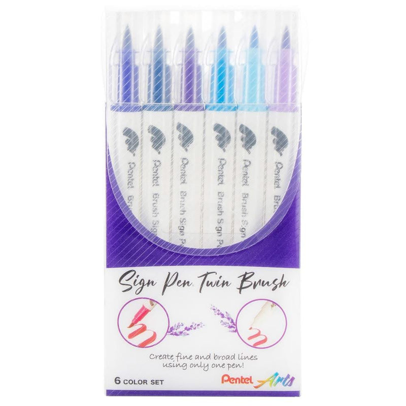 Pentel Arts Sign Pen Twin Brush 6/Pkg - Blue Hues - Create fine and broad lines using only one pen. One marker with a brush tip at both ends, the perfect combination! Broad brush tip on one end, fine brush tip on the other. Broad brush feels soft and slightly flexible. Fine tip has a slightly firmer feel, and is highly resistant to abrasion. The water-based blendable ink is perfect for hand letting, illustrations, cards, and freehand designs. This package contains 6 dual-tipped brush pens in assorted hues. Available in a variety of colors.
