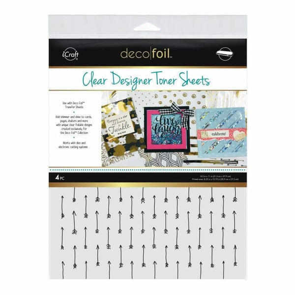 Deco Foil Clear Toner Sheets 8.5"x11" - 4 pack - Arrows. Add shimmer and shine to cards, pages, shakers and more with the Deco Foil Clear Designer Toner Sheets! These unique foilable designs can be used with Deco Foil Transfer Sheets, alcohol inks, and markers (each sold separately) to create one-of-a-kind designs. Can be die cut or used with electronic cutting systems and are compatible with most hot laminators (each sold separately). Package includes 4 sheets. Sheet size: 8.5in x 11in (21.5cm x 27.9cm).