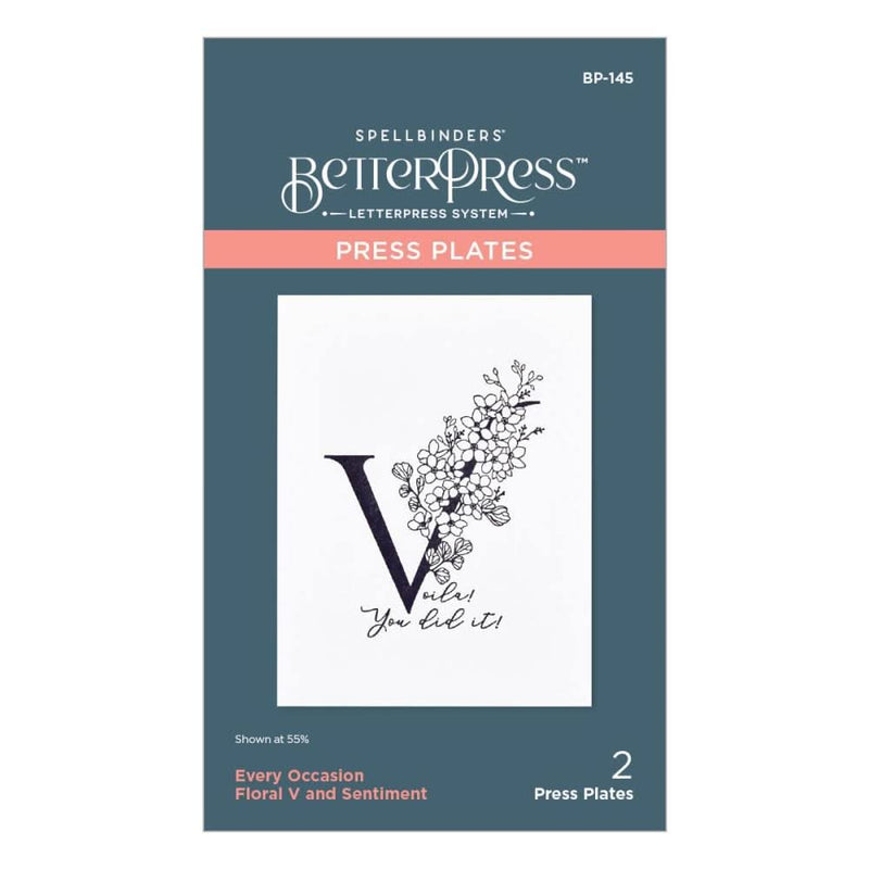 Spellbinders BetterPress Letterpress System Press Plates Floral V - Introducing the Spellbinders Every Occasion Floral Alphabet Collection Press Plate letter V. This press plate is a must-have for all your paper crafting projects. Compatible with the BetterPress system and leading manual die cutting machines (sold separately), it allows you to effortlessly add a touch of elegance to your cards, scrapbook pages, journals, and more. Featuring a contemporary uppercase V font with delicate floral details, this press plate adds a unique and sophisticated element to any design. The set also includes a sentiment plate that says "Voila," with the letter V as its own press plate. With dimensions of 2.93'' x 3.36'' for the letter and 1.88'' x 0.72'' for the sentiment, this press plate is the perfect addition to your crafting room. Get creative and let your imagination run wild with the Spellbinders Every Occasion Floral Alphabet Collection Press Plate V.