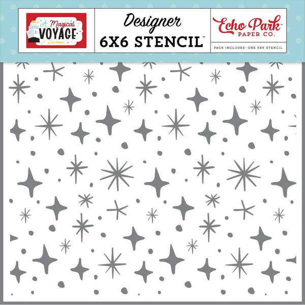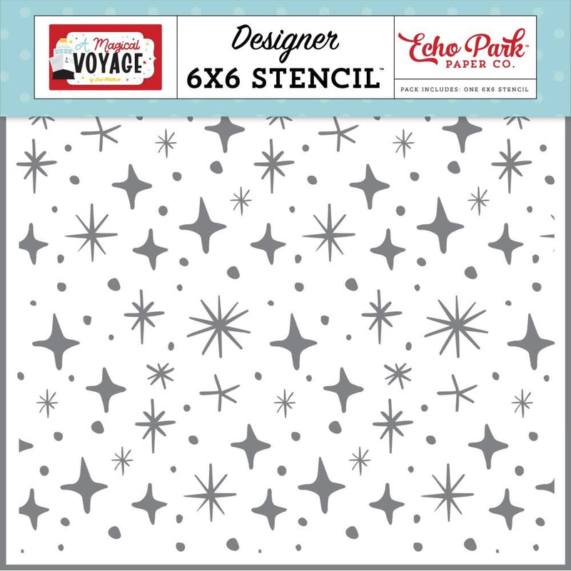Echo Park A Magical Voyage Stencil 6"X6" Sparkly Memories - Stencils are perfect for using on mixed media, card making, scrapbooking, textile art and so much more. Use them together or on their own. They are made from durable mylar and can be used with paint, ink, ink pads, chalk, mica mists and more. They are a great addition to your die cutting embossing machine. Stencils can also be used to dry emboss for a more delicate effect. This package contains 6x6 inch stencil.