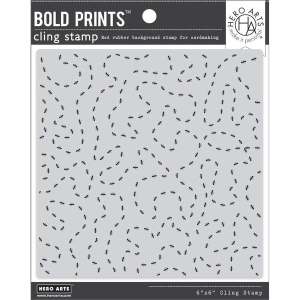 Hero Arts Background Cling Stamp 6"X6" Marching Ants Bold Prints - This repositionable red rubber cling stamp, Marching Ants Bold Prints is from Hero Arts. This background stamp features a trail of marching ants that covers the entire stamp. This stamp will cover the front of an A2 card and can be rotated in any direction. This large stamp will adhere to an acrylic block and can be used with your favourite inks, markers, embossing powders, and other crafting mediums (sold separately). This stamp can be used on cards, scrapbook pages, tags, journals, and other paper crafting projects. This stamp measures 6" x 6". This stamp is handmade in the USA.
