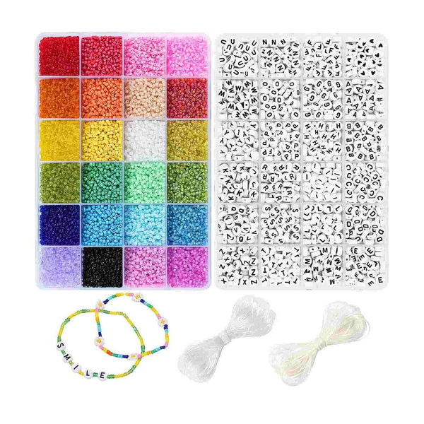 Poppy Crafts Alphabet Bead Kit #5 - Black & White + Colourful Glass Beads. This Poppy Crafts Bead Kit will keep you busy for hours. This is a great combination for anyone to start making jewellery or add to your collection. These beads will add a little extra fun to your jewellery-making projects. Excellent size for suspending small items from delicate necklaces, bracelets, earrings, anklets and many ornaments. This package contains approximately 1200 Alphabet beads, 8400 colourful glass seed beads, 4.5m clear elastic cord, 4.5m white elastic cord, and 2x storage boxes with 24 compartments.