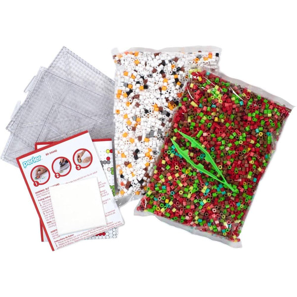 Perler Fused Bead Kit 3D Toy Shop - Gingerbread - This Toy Shop Kit by Perler makes a great family project for the Christmas season. The 3-dimensional holiday design features Santa's North Pole toy shop decked out in Christmas colours, as well as Santa riding a train, an elf, toy soldiers, a reindeer and an assortment of toys. Use the included patterns to create flat fused bead shapes that snap together to form this festive display. Detailed illustrated instructions provided. This package contains 10 000 beads, 2 pegboards, 2 pattern sheets with instructions, tweezers and ironing paper. Recommended ages six years and up.