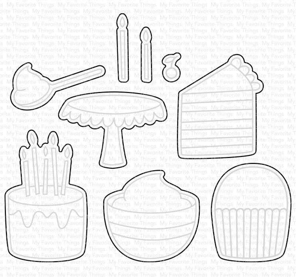 My Favorite Things - Die-namics - Birthdays Take the Cake. This Die-namics coordinates with the Birthdays Take the Cake stamp set for perfectly sized die cuts every time. It is open inside to allow you to stamp then cut OR cut then stamp. This feature makes the Die-namics lighter weight and allows for easier removal from the die.
