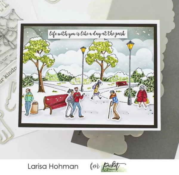 Picket Fence Studios 4"x 4" Stamp Set - More For A Walk In The Park - Send out cards throughout the year with the More for A Walk In The Park Clear Photopolymer Stamps by Picket Fence Studios. The package contains 23 clear photopolymer stamps that can be used with an acrylic block, your favourite inks, and the coordinating More for A Walk In The Park dies (BB-138D), each sold separately. The set includes phrases like "We Miss You," "Big Hugs," "Happy Birthday," "It's a perfect day to play," and more. Largest: 1" x 1.37", Smallest: 0.25" x 0.25". Also available separately are A Walk In The Park stamp set (BB-137) and its coordinating dies (BB-137D).