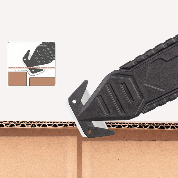 Universal Crafts Safety Edge Box Cutter. Safety is the priority with our knife featuring a recessed blade design, preventing accidental injuries or cuts. Ideal for opening boxes, packages, and slicing pallet stretch wrap without harming contents. Innovative tape punch ends add ease and safety to box opening. Compact and lightweight, this safety knife is easy to carry in any pocket. Size: 3.5cm x 14.5cm.