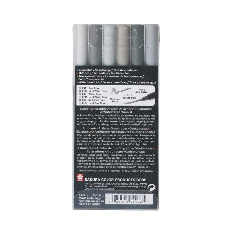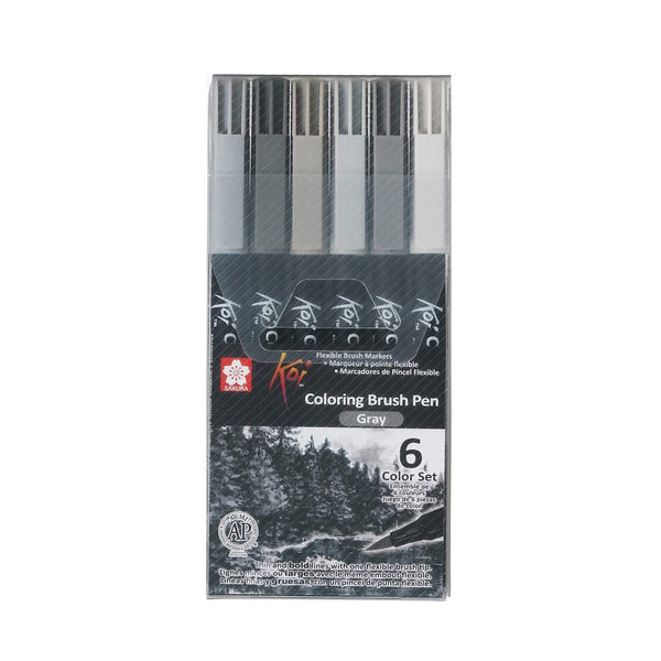 Koi Colouring Brush Pen Set - Grey 6 Pack. Ideal for drawing, illustration, designing & sketching! These brush pens have a flexible brush tip with which you can simply draw lines of various thicknesses. The ink is water-based and enables wonderful colour gradations to be created. Pigma Micron is recommended for outlining before colouring with this item. Available in 48 colours & a blender, each sold separately. This Package includes 6 colouring brush pens. Tones include cool grey, dark warm grey, warm grey, light warm grey, dark cool grey and light cool grey.