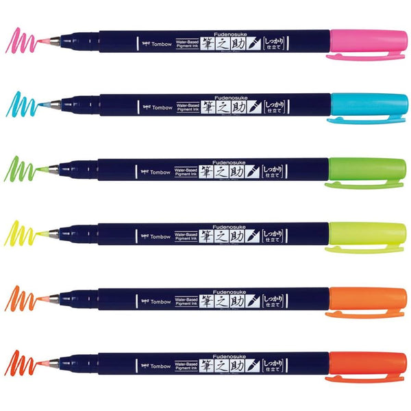 Tombow Fudenosuke Neon Brush Pens 6 pack - Flexible brush tips allow easy transition from thick to thin lines by changing pen pressure. Water-based pigment ink allows rich vibrant colours that won't bleed through most papers. Great for calligraphy, hand lettering and illustration. Set includes six pens in Neon Red, Neon Orange, Neon Green, Neon Blue, Neon Pink and Neon Yellow.