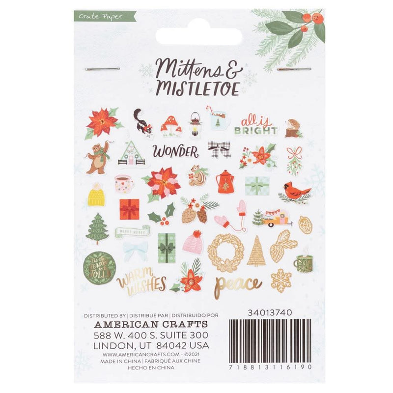 Crate Paper Mittens & Mistletoe Ephemera Die-Cuts 40 pack - Icons with Gold Foil Accents - This package of 40 pieces of die cut ephemera is part of the Mittens and Mistletoe Collection from Crate Paper. This package includes five gold foiled die cuts and five kraft die cuts with white details. This package also includes a bear, a chipmunk, a skunk, a coffee pot, a lantern, a cup of cocoa, a cup of coffee, a hat, mittens, holly leaves and berries, a poinsettia, pine cones, pine branches, a porcupine, and more. These pieces can be added to cards, scrapbook pages, tags, journals, planners, and other paper crafting and mixed media projects.