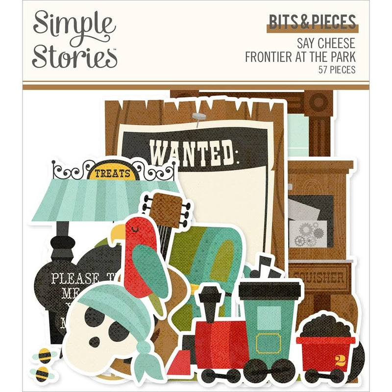 Simple Stories Say Cheese Frontier At The Park Bits & Pieces Die-Cuts 57 Pack - This package of 57 die-cut Ephemera Bits and Pieces is part of the Say Cheese Frontier At The Park Collection from Simple Stories (other items in the collection sold separately). This package includes a Country Bear, a guitar, Splash Mountain, a goat, a pirate treasure, a train, pirate clothes, words and phrases and more. These pieces of ephemera can be used for cards, scrapbook pages, tags, journals, planners and other paper crafting and mixed media projects.
