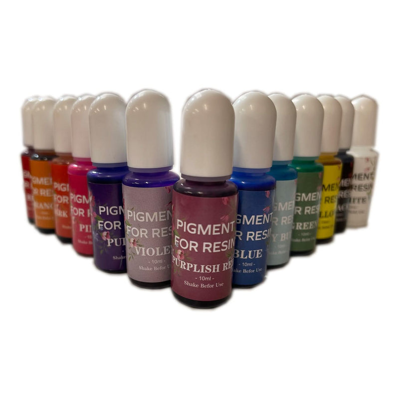 Poppy Crafts Pigment Ink for Resin - 13 Pack. This pigment ink is used to colour UV resin. High quality materials, no odour, no toxins & safe to use. 10ml per bottle. 13 Colours: Red, Orange, Dark Orange, Pink, Purple, Violet, Purplish Red, Blue, Sky Blue, Green, Yellow, Black & White. These have a blocker in the pourer that require you to cut the tip with scissors. Shake well before use.