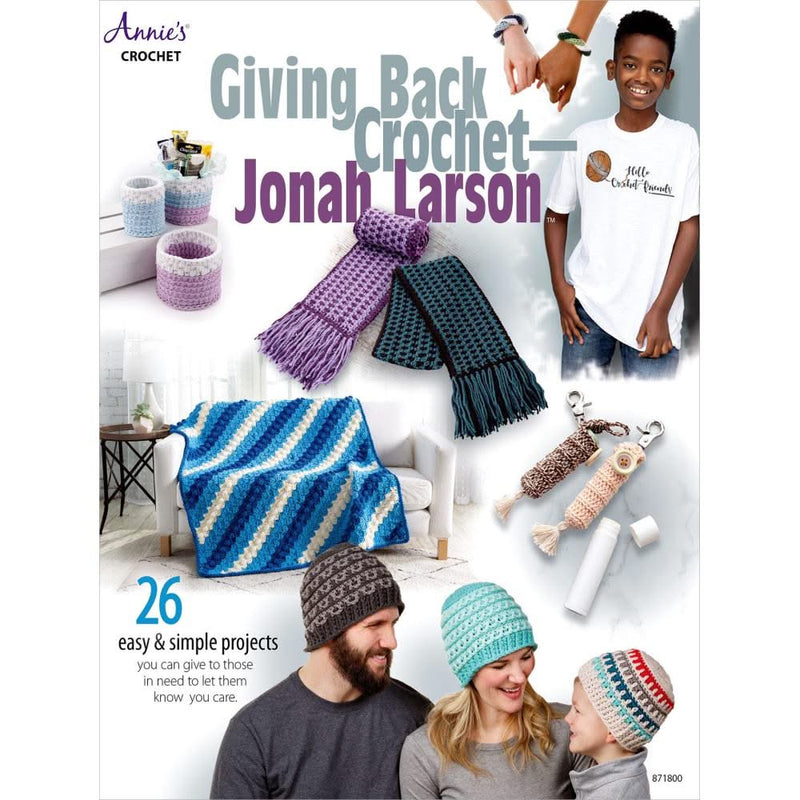 | Annie's Books Giving Back Crochet - Jonah Larson - Jonah Larson taught himself to crochet when he was 5 years old and gained overnight global notoriety. Jonah was born in Ethiopia and adopted as a baby. Luckily for him and them, he found that crochet had a way of calming him down. This book grew out of Jonah's philosophy that part of living a happy life is giving to those in need. With this in mind you will find designs like hats, scarves, slippers and afghans that are easy and simple, and they make perfect gifts to give to those who find themselves in need, those who are suffering with terminal illness or someone who just needs to know that someone cares. Also included is a basic Learn to Crochet section. 64 pages. |