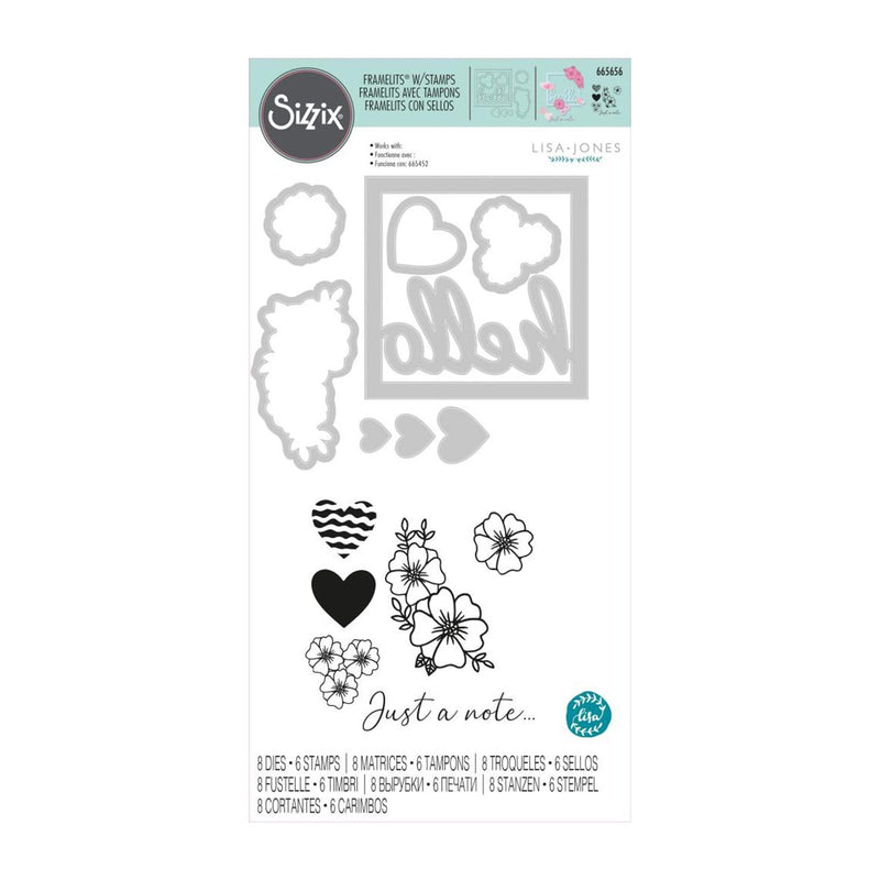 Sizzix Framelits Die & Stamp Set By Lisa Jones 8/Pkg - Floral Hello. Nothing says Spring crafting more than this Floral Hello Framelits Die Set with Stamps by Sizzix designer, Lisa Jones. This set offers floral cut outs and heart shaped extras which can be embellished using the stamps. You can also create a fun shaker card with this die cutting set by using it with the Sizzix Square Shaker Paness (665452, sold separately) and our collection of colorful sequins and beads. These wafer-thin chemically etched craft die sets feature the perfect registration without interference from any ridges at the edge of the die opening. Plus, they're excellent for clearly cropping photos and cutting windows in cards, bags, boxes and scrapbook pages. Designed to cut a single sheet of cardstock, paper, metallic foil or vellum, these dies also make great stencils and are perfect for layering to produce a 3-D effect. Dies are compatible with most die cutting machines (sold separately). Design Dimensions: 2 7/8" x 2 7/8" - 3/8" x 3/8". 8 Framelits and 6 Stamps.