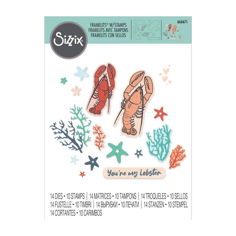 Sizzix Framelits Die & Stamp Set - You're My Lobster. The You're My Lobster Framelits® Die Set by Sizzix is your ultimate companion. This 14-pack die set also includes a 10-pack of stamps and is perfect for creating heartfelt gifts, romantic gestures, or simply spreading joy to your nearest and dearest. Included in this set you will find adorable lobster-themed designs including 2 lobsters, some starfish, seaweed and the phrase ‘you’re my lobster’. This die set is compatible with most die-cutting machines (sold separately). Design Dimensions Stamps:1 1/2” x 2 1/2” - 3/8” x 3/8” (3.81cm x 6.35cm - 0.95cm x 0.95cm), Dies: 2 3/8” x 1 7/8” - 1 1/2” x 3/8” (6.03cm x 4.76cm - 3.81cm x 0.95cm).