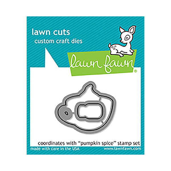 Lawn Cuts Custom Craft Dies - Pumpkin Spice. This die coordinates with the Lawn Fawn Clear Stamp Set - Pumpkin Spice, for perfectly die-cut images, each sold separately. These dies are compatible with leading die-cutting machines (sold separately). These dies can be used on cards, scrapbook pages, tags, journals, and other paper crafting projects. Size: largest die 1.75"x 1.5" (4cm x 3.2cm).