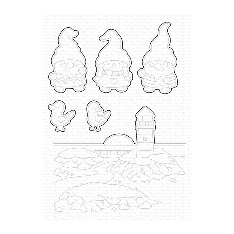 My Favorite Things Die-Namics Dies - Lighthouse Gnomes. Gnomes by the seashore — what a delight! This trio of gnomes can enjoy a day at the beach bolstered by a generously sized rocky shore home to a cute little lighthouse. The sun on the horizon is perfect for crafting an early morning or dusk scene — take your pick and work your magic! This die coordinates with the Lighthouse Gnomes stamp set (JB-009) for perfectly die-cut images, sold separately. The dies are open inside to allow you to stamp then cut or cut then stamp. This feature also allows for easier removal of the die cuts. The lighthouse scene die is an edge-only die, allowing you to customize the height of your background scene panel. The dies are compatible with most die-cutting machines (sold separately). (6) piece set.