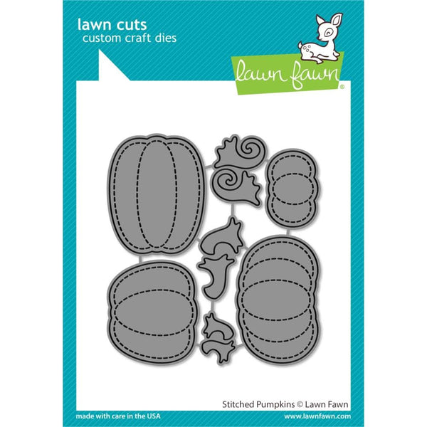 Lawn Cuts Custom Craft Die Stitched Pumpkins - This seven piece Lawn Cuts custom craft die set, Stitched Pumpkins, is from Lawn Fawn. This die set features four pumpkins with stitching on them and three sets of stems. These dies are compatible with leading die cutting machines (sold separately). These dies can be used on cards, scrapbook pages, tags, journals, and other paper crafting projects. The largest die measures 1.375" x 1.125" and the smallest die measures 1" x 1.125". This die set is made in the USA.