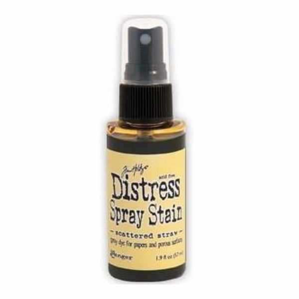 Tim Holtz Distress Spray Stain 1.9oz Bottle - Scattered Straw. Spray through any stencil or directly onto a porous surface. Create a blended effect by layering stain colours and spritzing with water. Included is one 1.9 fl oz bottle of water-reactive stain. Comes in a variety of colours. Each sold separately. Conforms to ASTM D 4236. Made in USA.
