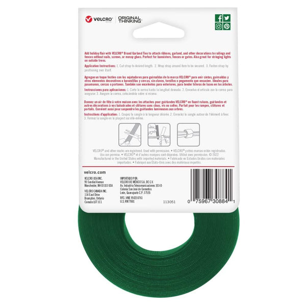 VELCRO® Holiday Garland Ties .5"X30' Green - Preparing for the holidays doesn't have to be difficult with VELCRO Brand Hook and Loop fasteners. These ties make getting that perfect look easy! Holiday colors allow it to blend in for a seamless look. Adjustable and reusable. Cut it to the perfect length. This package contains 30 feet of 0.5 inch wide VELCRO®. Available in a variety of colors. Each sold separately. Made in the USA.