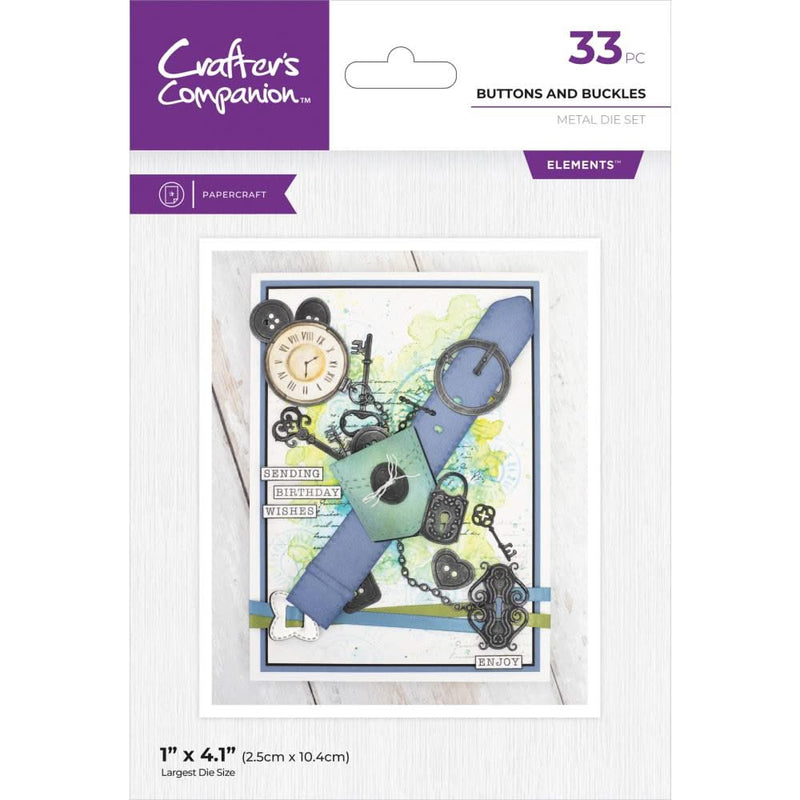 Crafter's Companion Metal Die Elements Buttons And Buckles - Discover endless creative possibilities with the Crafter's Companion Buttons And Buckles Dies. This versatile set includes 33 precision metal dies that cut out a variety of buttons, buckles, keys, and locks. The largest die measures 1 x 4.1 inches, and the set is compatible with leading die-cutting machines. Crafters can use these dies to cut paper, cardstock, tissue, vellum, and foil to add unique embellishments to their projects. With the ability to mix and match elements, create pocket watches, belts, and pocket toppers for cards, gift boxes, and scrapbook pages. Some dies even feature intricate embossing designs, such as stitches and clock faces, that can be enhanced with pens, inkpads, or gilding flakes. Replace scissors or a craft knife with this must-have set to achieve delicate and precise cut-out designs.