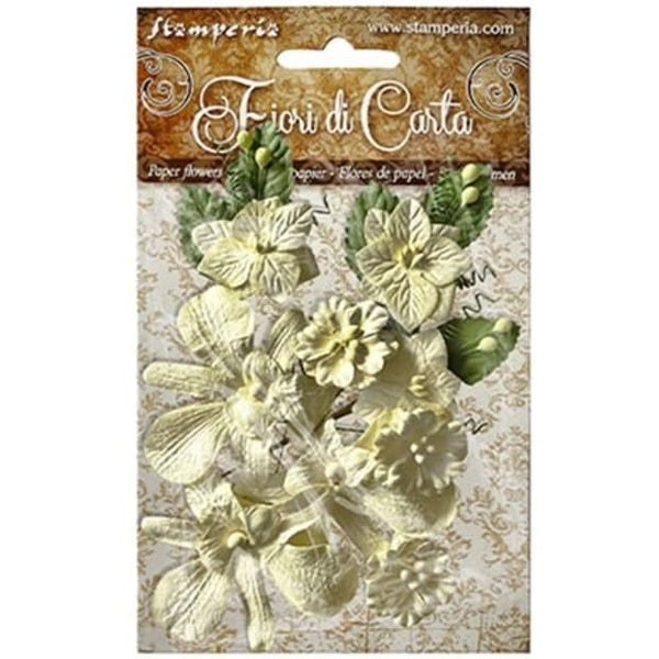 Stamperia Paper Flowers Orchids & Flowers - Vanilla/Cream with tinges of Lemon - Flowers made by hand in natural papers and coloured with natural dyes. 3.5 x 6 package. Includes 9 flowers plus leaves.