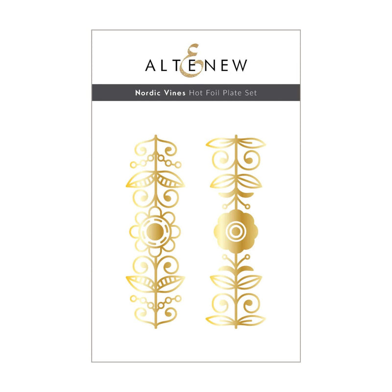 Altenew Nordic Vines Hot Foil Plate Set. The Nordic Vines Hot Foil Plate Set showcases two exquisite and detailed vine and foliage patterns, perfect for any occasion. Add a touch of elegance and sophistication to your creations with these hot foil plates, making them an indispensable addition to your crafting toolkit. There are 2 plates in this set. This hot foil set coordinates with the Nordic Vines die set (ALT8221), each sold separately. Hot Foil Plate Dimensions: Nordic Vine (1): 1.7" x 5.5" ▪ Nordic Vine (2): 1.7" x 5.5".