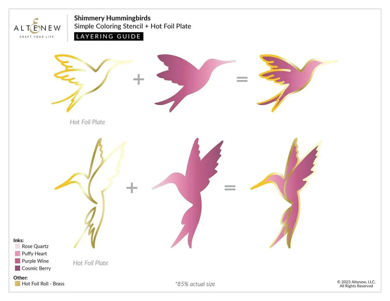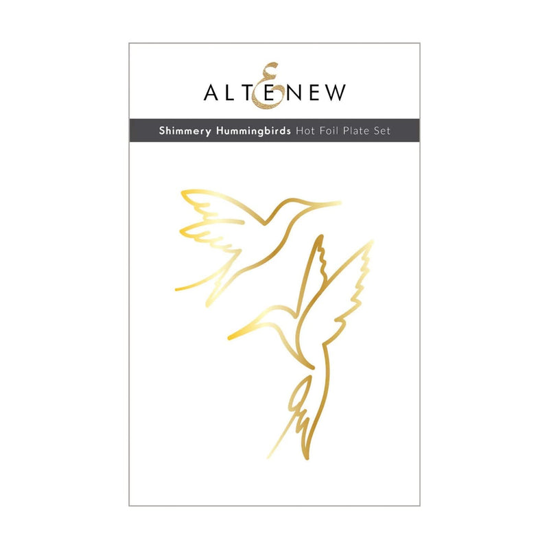 Altenew Shimmery Hummingbirds Hot Foil Plate Set. Capture the essence of garden magic with stylish elegant minimalist-style hummers for your papercrafts! Add some shimmer to your projects with the 2 gorgeous minimalist-style hummingbirds in the Shimmery Hummingbirds Hot Foil Plate Set. Use the coordinating die set (ALT7972) and simple colouring stencils (ALT7973) to add magic and bring these hummingbirds to life, each sold separatly. There are 2 hot foil plates in this set. Hot Foil Plate Dimensions: Hummingbird 1 - 2.7" x 1.9" ▪ Hummingbird 2 - 2.4" x 3.7".