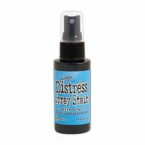 Tim Holtz Distress Spray Stain 1.9oz Bottle - Salty Ocean. Spray through any stencil or directly onto a porous surface. Create a blended effect by layering stain colours and spritzing with water. Included is one 1.9 fl oz bottle of water-reactive stain. Comes in a variety of colours. Each sold separately. Conforms to ASTM D 4236. Made in USA.
