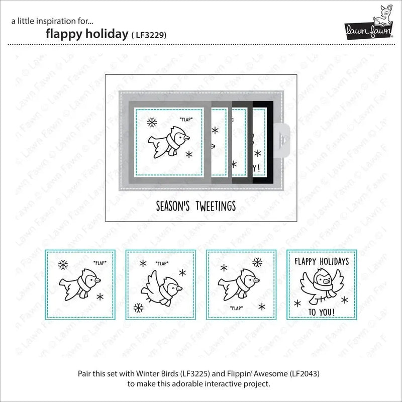 Lawn Fawn Clear Stamp Set Flappy Holiday - This five piece clear photopolymer stamp set, Flappy Holiday, is part of the Christmas Collection from Lawn Fawn. This stamp set features two birds flying, a snowflake, the word FLAP, and the sentiment HAVE A FLAPPY HOLIDAY! These stamps adhere to acrylic blocks and can be used with your favourite inks, markers, embossing powders, and other crafting mediums (sold separately). These stamps can be used on cards, scrapbook pages, tags, journals, and other paper crafting projects. The largest stamp measures 1.375" x 1.25" and the smallest stamp measures 0.375" x 0.375". This stamp set is made in the USA.