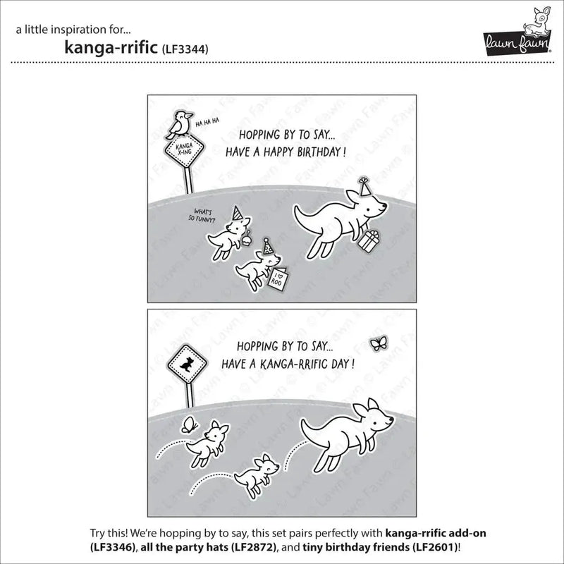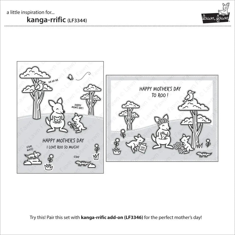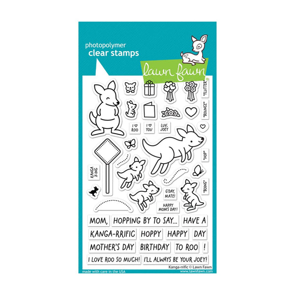 Lawn Fawn Clear Stamp Set - Kanga-rrific. We’re just hopping with inspiration to share with you! This adorable kangaroo set is perfect for Mother’s Day, birthdays, and sending happy hellos! This set includes a mama kangaroo with a pouch that can carry a joey, gifts, or any precious cargo. We hope “roo” and yours have an amazing time creating with this set! Celebrate a new baby by pairing these critters with Kanga-rrific Baby Sentiment Add-On (LF3348), sold separately. Coordinating Lawn Cuts: Kanga-rrific Lawn Cuts (LF3345), each sold separately. Size: 4"x 6".
