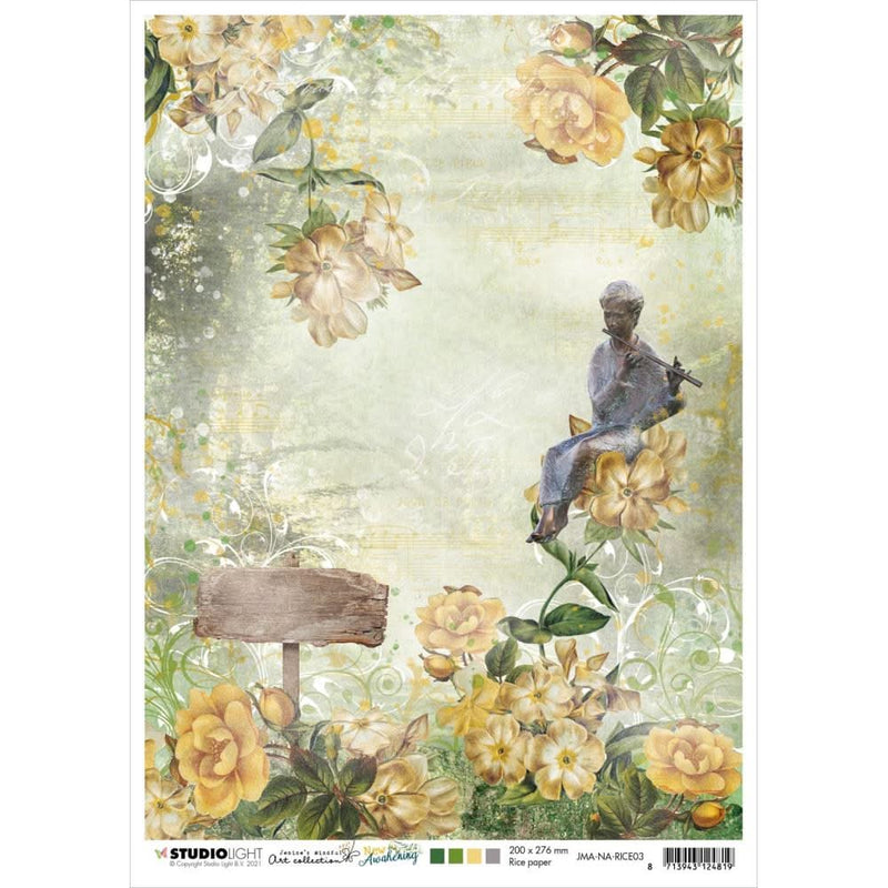 Studio Light Jenine's Mindful Art New Awakening Rice Paper Sheet A4 - NR. 03, Flute/Flowers/Sign - Rice paper is a soft but strong paper, tearable (make a wet line where you wish to tear it), used for collage work. Apply using white glue that dries clear, or Mod Podge. Great for covering paper mache boxes, wood items, etc.