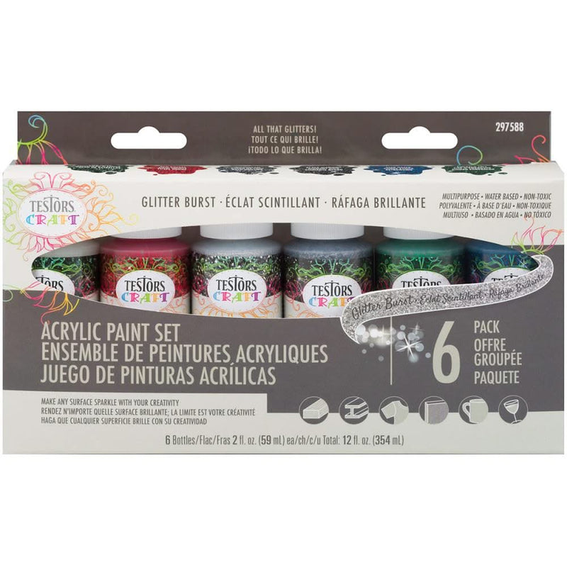 Testors Craft Acrylic Paint Set 6 pack -Glitter Burst - This high-quality waterbased paint is great for general craft and decorative painting. Perfect for wood, paper mache, terracotta and most porous surfaces as well as ceramic bisque and glass! Paint is permanent but can be cleaned up with soap and water while wet. This package contains six 2oz bottles of glitter acrylic paint in assorted colours. Non-toxic. Conforms to ASTM D4236. Made in USA.