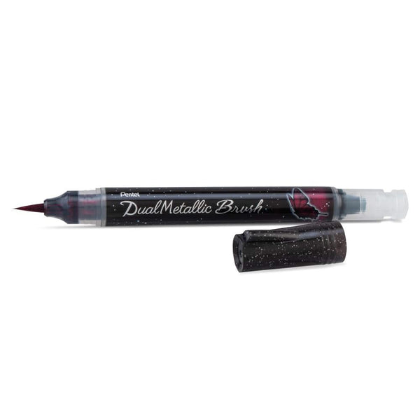 Pentel Dual Metallic Brush - Black/Metallic Red - New innovative reflective and sparkling iridescent ink is ultra glittery. Ink looks like a different colour when writing on black or white paper. Perfect for cards, invitations, drawings, doodles, and other designs. Nylon brush nib, push plunger for providing ink flow. This package contains one dual metallic brush pen. Available in a variety of colours, each sold separately.