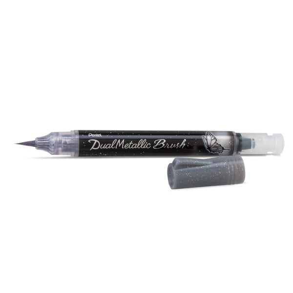 Pentel Dual Metallic Brush - Metallic Silver - New innovative reflective and sparkling iridescent ink is ultra glittery. Ink looks like a different colour when writing on black or white paper. Perfect for cards, invitations, drawings, doodles, and other designs. Nylon brush nib, push plunger for providing ink flow. This package contains one dual metallic brush pen. Available in a variety of colours, each sold separately.