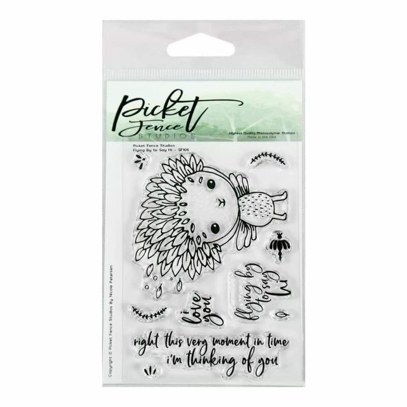 Picket Fence Studios 3 inch X4 inch Stamp Set Flying By To Say Hi - Unique, beautiful and creative stamps designed by Nicole Petersen. Use with paints and inks. Perfect for card making, journaling, scrapbooking, and mixed media. Design: Flying By To Say Hi. Package includes a large Sunshine Friend and illustration along with three sentiments on a 3 x 4 inch backing sheet
