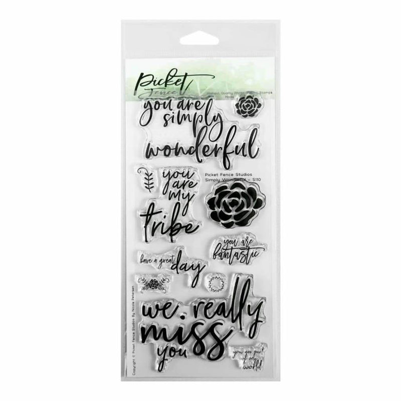 Picket Fence Studios 4 inch X8 inch Stamp Set Simply Wonderful - Unique, beautiful and creative stamps designed by Nicole Petersen. Use with paints and inks. Perfect for card making, journaling, scrapbooking, and mixed media. Design: Simply Wonderful. Package includes five floral images and six sentiments on a 4 x 8 inch backing sheet.