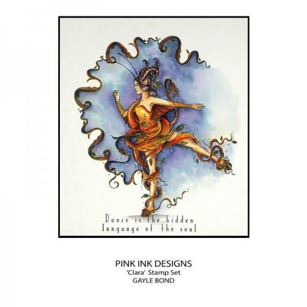 Pink Ink Designs 6"x 8"(15.2cm x 20.3cm) Clear Stamp Set - Clara - This 10 piece clear photopolymer stamp set, Clara, is part of the Mythical Series from Pink Ink Designs and Creative Expressions. This stamp set features Clara in a dancing pose, extra feathers and foliage designs and the phrase "Dance is the hidden language of the soul". These stamps adhere to acrylic blocks or stamping tools and can be used with your favourite inks, markers, embossing powders, watercolours, coloured pencils and other crafting mediums (sold separately). The stamps can be used on cards, scrapbook pages, journal and planner pages and other paper crafting and mixed media projects. The largest stamp measures 4.93"x 6.37"(12.5cm x 16.2cm) and the smallest stamp measures 0.43"x 0.81"(1.1cm x 2.1cm).