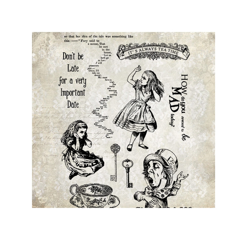 Poppy Craft Stamps #313 Alice's Adventures in Wonderland - 6" x 8". From the wonderous under world, this Alice's Adventures in Wonderland Stamp is a staple in your crafting kit! Use the Stamps for cards, scrapbook pages, tags, journaling, planner pages and any other paper crafting and mixed media projects (sold separately). The Stamp shows a variety of scenic images from Alice's Adventures in Wonderland world including quoted statements, iconic characters and Alice herself. Recommended to mount on an acrylic block, the stamps can be used with your favourite inks, markers, embossing powders, and other crafting mediums (each sold separately). The smallest Stamp measures at 3cm x 1.7cm, and ranges up to 11.5cm x 7.7cm (approx.)