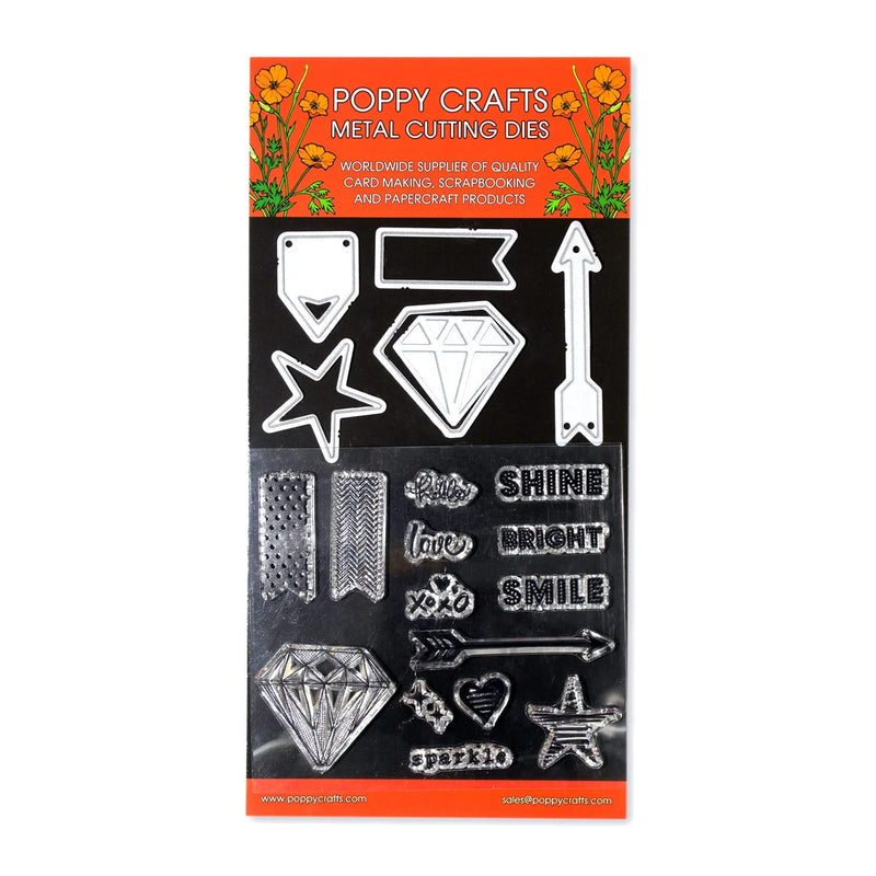 Poppy Crafts Metal Cutting Dies and Stamps Combo - Diamonds. Die sizes: flag 33mm x 13mm, tag 27mm x 18mm, arrow 55mm x 10mm, outer diamond 38mm x 33mm, inner diamond 27mm x 25mm, star 30mm. Stamp sizes: 2 flags 33mm x 13mm, arrow 54mm x 8mm, diamond 35mm x 30mm, star 25mm, hello 16mm x 7mm, love 15mm x 9mm, xoxo 15mm x 10mm, sparkle 25mm x 4mm, shine 28mm x 8mm, bright 27mm x 7mm, smile 26mm x 7mm, love heart 13mm x 14mm, sparkle elements 12mm x 9mm.