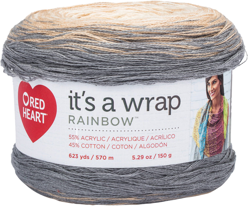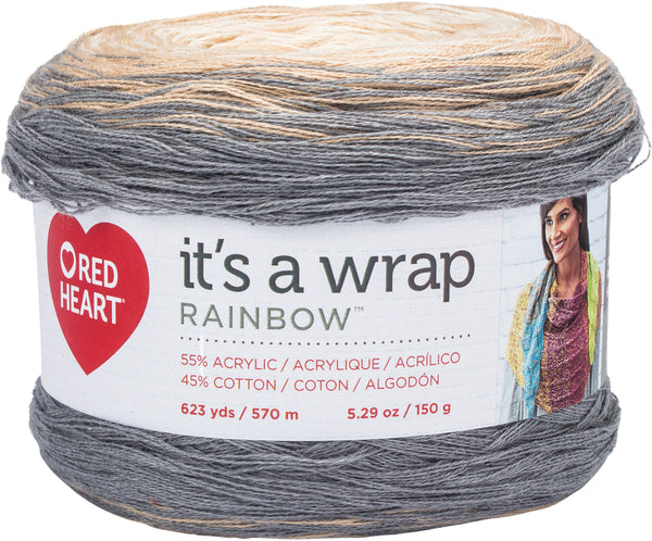 Red Heart It's A Wrap Rainbow Yarn - Foggy - Lovely drape and exceptionally soft hand make this a dream to wear. One ply is hand tied at each colour change making the colors move in a beautiful rainbow of color. Weight category: 1. Content: 55% acrylic, 45% cotton. Putup: 5.29oz/150g, 623yd/570m. Gauge: 26sx32r = 4in/10cm on size US2/2.75mm knitting needles. Suggested crochet hook size: D-3/3.25mm. Dyelotted: we try but are not always able to match dyelots. Care: machine wash, dry flat, do not iron, do not bleach, do not dry clean. Comes in a variety of colors. Each sold separately. Imported.