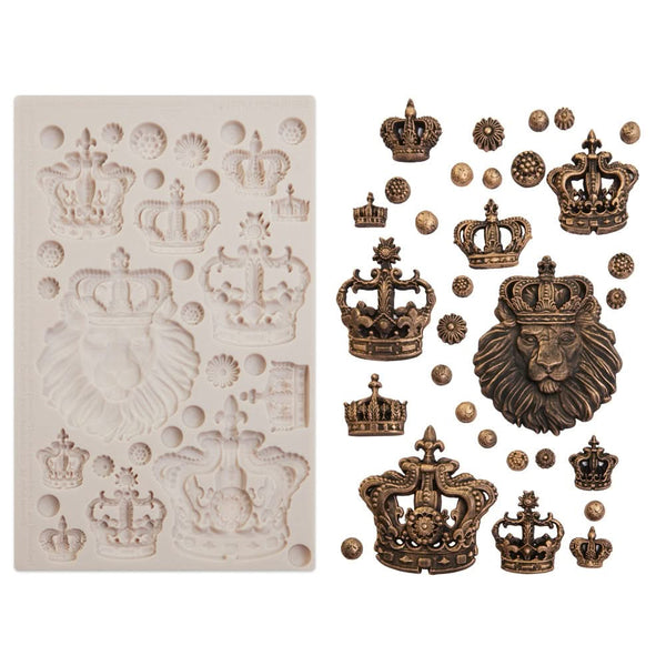 Finnabair Decor Moulds 5"X8"X8mm Regalia - This silicone mould, Regalia is part of the Finnabair Collection from Prima Marketing. This mould features a lion's head, a variety of styles and sizes of crowns, and small flower shapes. This silicone mould is heat resistant and food safe. It can be used with resin, hot glue, clay, melting chocolate, fondant, and other mediums (sold separately) to create either edible candies or embellishments. This mould measures 5" x 8" x 8 mm.