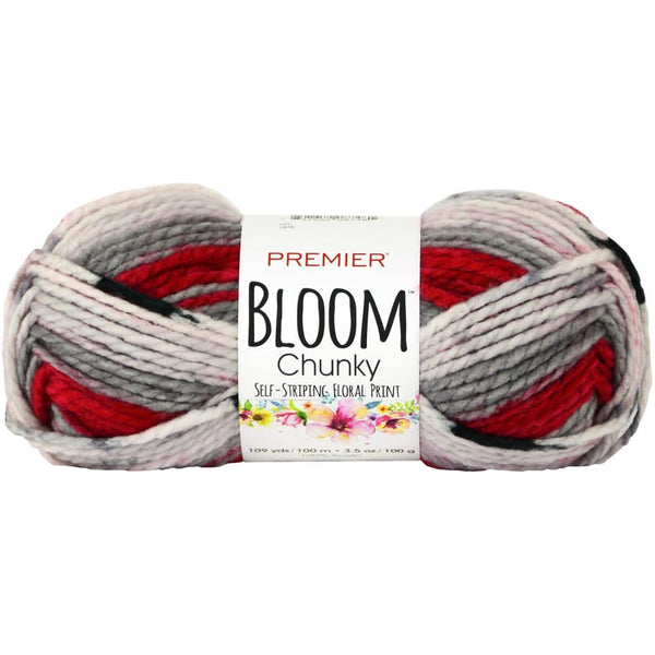 Premier Yarns Bloom Chunky Yarn - Poppy. Fun, functional, and fast, Bloom Chunky creates almost effortless colour work with a self-patterning floral or dot print, at any gauge, in knit or crochet. Ideal for beginners, machine-washable, and snuggly soft, making it the perfect choice for quick and easy accessories and home decor for yourself or someone special.