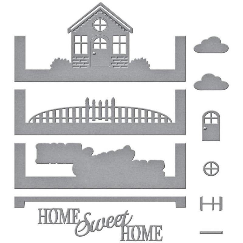 Spellbinders Etched Dies - Cozy Home Scene - Cozy Home Scene Etched Dies are a part of the Make a Scene Collection by Becca Feeken of Amazing Paper Grace. The set of nine thin metal dies creates a sweet and cozy home-inspired scene. The Top and Bottom Insert Frame help attach the scene to the card base. The scene dies are the house, fence, and sentiment with its outline. To accent, there are two clouds, a door, door sill, circular window and window pane. Designed to be used with S6-165 Make a Scene Card Base Etched Dies Set (sold separately).